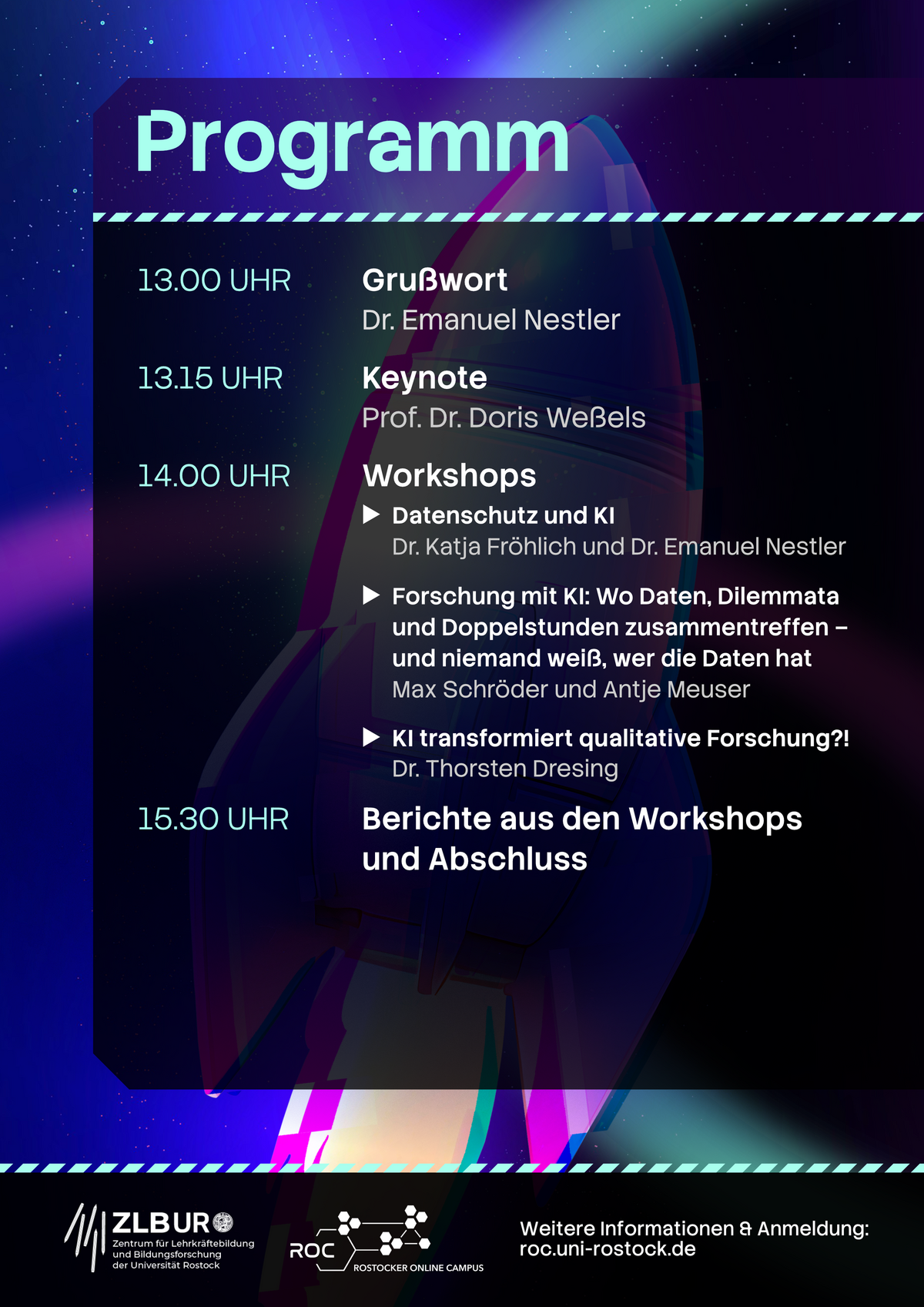 Der Workshop beleuchtet, wie KI in der bildungswissenschaftlichen Forschung sinnvoll eingesetzt werden kann. Im Dialog zwischen den Teilnehmer:innen, der Datenschutzbeauftragten der Universität Rostock und mit einem konkreten Forschungsbeispiel aus der Biologiedidaktik werden mögliche Vorgehensweisen diskutiert. Im Fokus steht das Spannungsfeld zwischen methodischer Innovation unter Nutzung von KI und datenschutzrechtlichen Anforderungen. Anhand konkreter Fallbeispiele didaktischer Forschung werden Erhebung, Transkription, Anonymisierung und Pseudonymisierung sowie KI-gestützte Auswertung diskutiert. Dabei werden unterschiedliche Tools, Einsatzszenarien und datenschutzrelevante Bedingungen praxisnah eingeordnet. Es ist das Ziel, Chancen, Grenzen und Handlungsbedarfe für den verantwortungsvollen KI-Einsatz in Forschungsprozessen sichtbar zu machen.